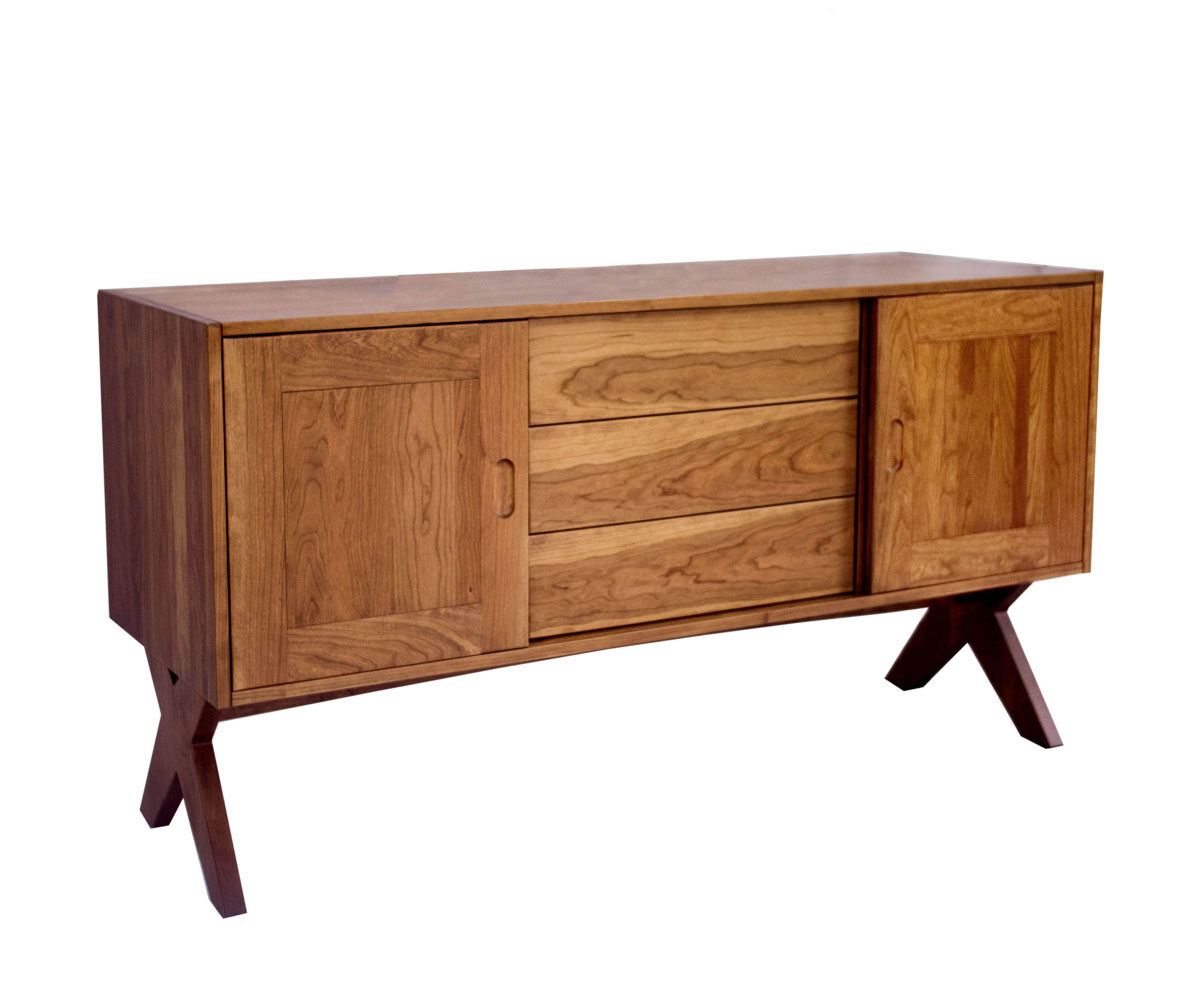 Features: • Rolling sliding doors with finger pulls • Adjustable shelf behind each door • Push to open dovetailed drawers in center