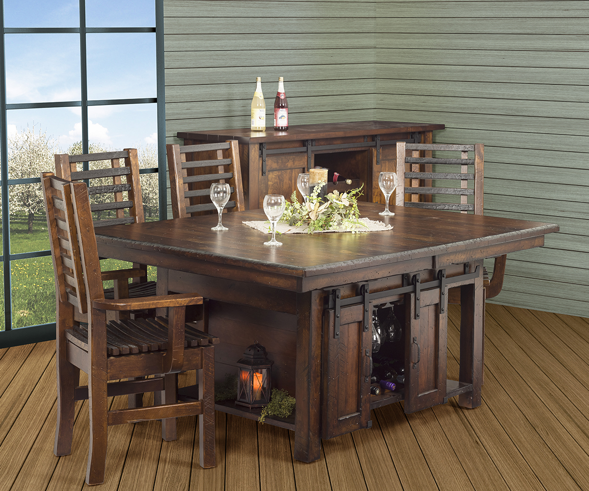 Table shown 48 x 66″ in rustic cherry with aged caramel stain. Square corner with hand-hewn edge. Barrel back chairs.